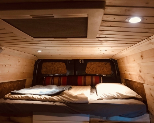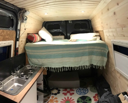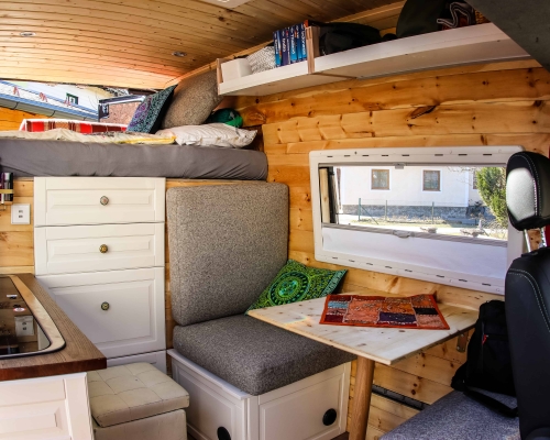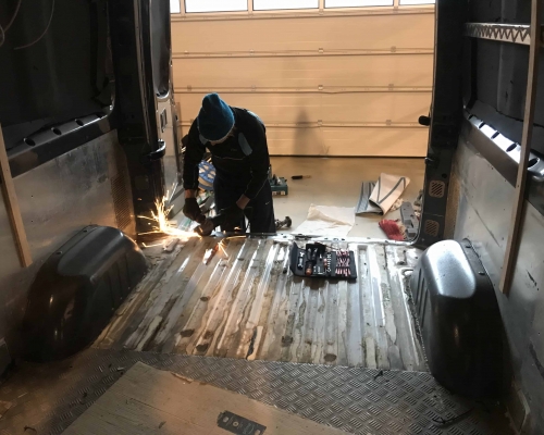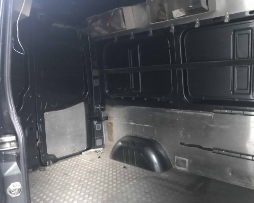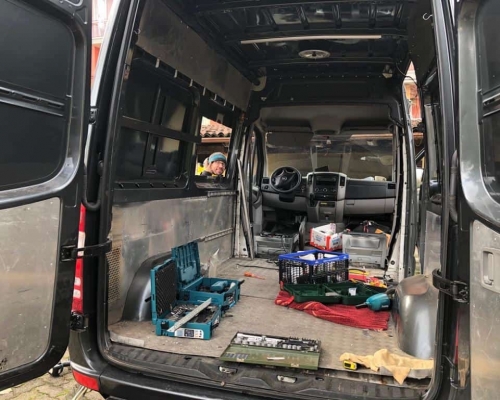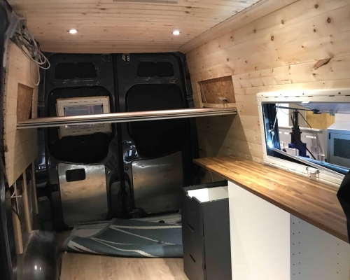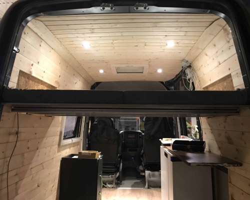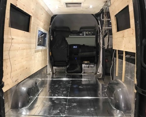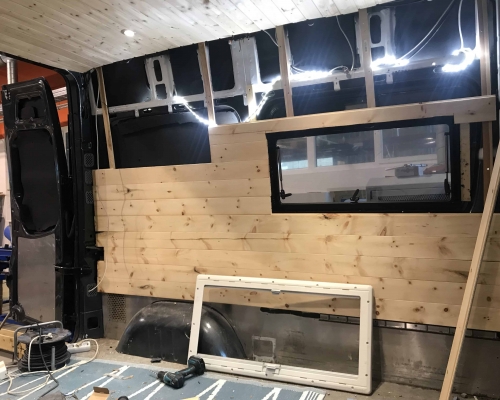 Roof window, insulation, pioneer sound system, paneling and preparation for the electrical installation in progress..